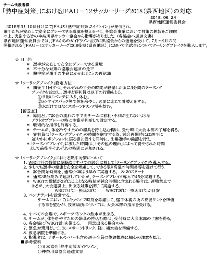 県西地区運営委員会では、JFAからのガイドライン並びに県協会からの通達を受けて、7月~9月の間 開催される「JFAU-12サッカーリーグ2018後期(県西地区)」において全試合についてクーリングブレイクを導入します。 尚、期間中に開催される各種大会においても、クーリングブレイクを励行しましょう。