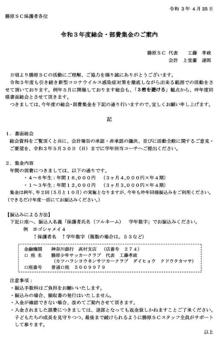 尚、途中入部される方は、本紙を参考に部費を算出し、各学年コーチ経由、または銀行振込にて部費のお支払いを頂ければ幸いです。(前述記載の入部申込書を事前に提出ください。)